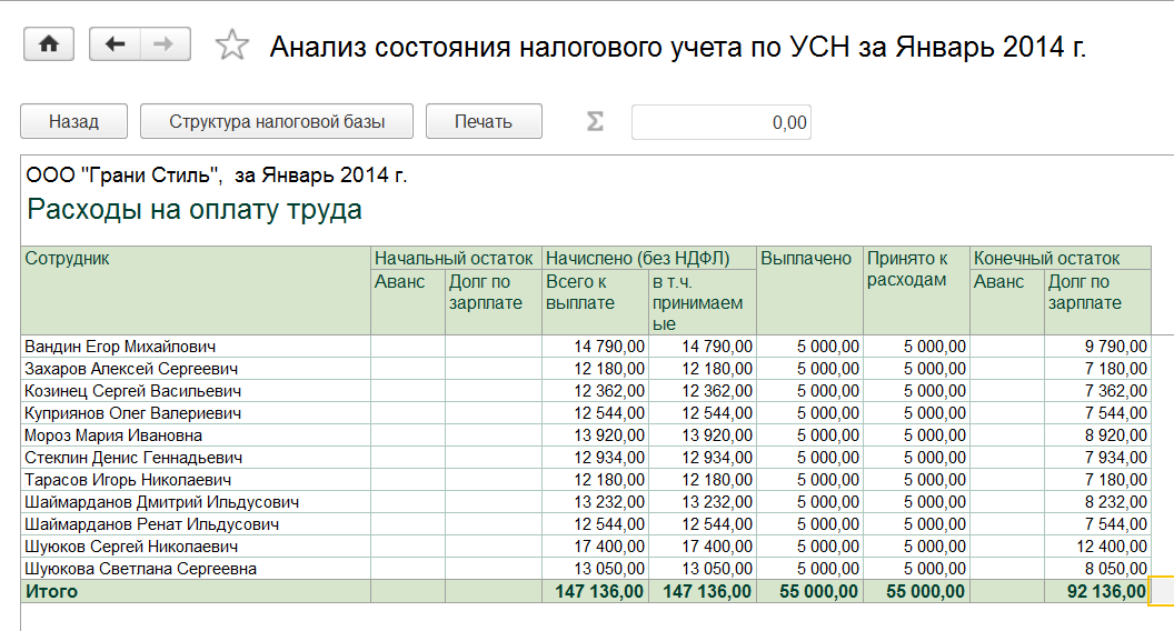2- делаем отчет "Анализ учета по УСН - Расходы на оплату труда" Начальный Остаток увеличивается на сумму удержания каждый месяц. С начала периода (январь 2014 г) удержания по Тарасову. (рис 5,6,7,8)