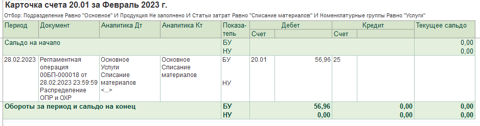 В феврале нет ни единой реализации. Выпуска продукции тоже нет. Делаю закрытие месяца - и по НУ проходит проводка Д90.08.1 К20.01 Смотрим что это за суммы. Это Прочие расходы по одной из номенклатурных групп. НО !!! Это не те, которые с 25 или 26 счетов, и которым положена в НУ на 98й закрываться. Это закрывается именно 20й счёт, а туда эти суммы пришли с 71.01 (авансовый отчёт), 10.03.1, 10.01, 41.01 (требование-накладная). Сделала НЗП, но это не помогло. Что за прикол такой? Вот сроду так не было ((