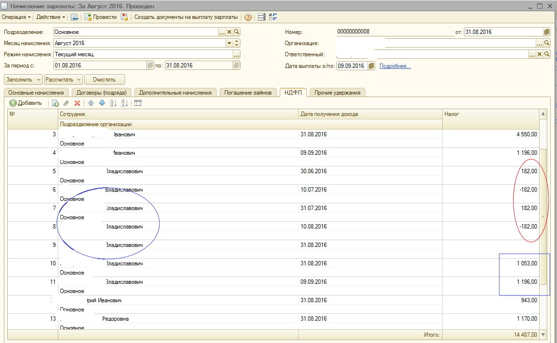 В прошлом месяце НДФЛ равномерно распределили вручную, а в текущем месяце 1С распределила НДФЛ корректно на всех сотрудников. В чем была ошибка так и не понял.