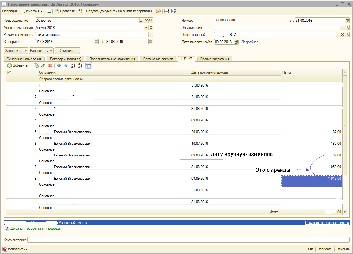 Ну вот, приплыли... удалила начисления аренды. А у сотрудника и вовсе вычет на ребенка не применяется. А он есть.