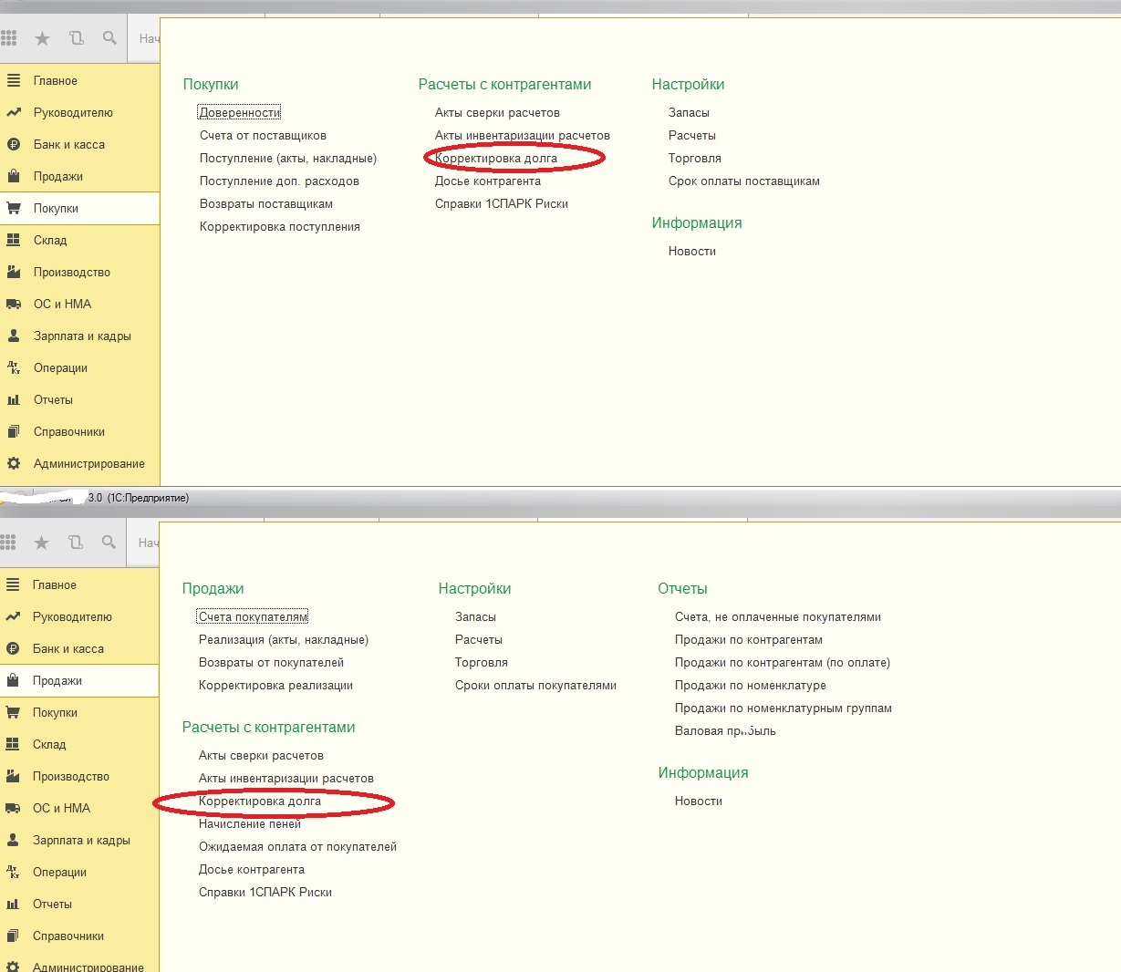 Shayk, если чего-то нет, то можно через Все функции (слева вверху кружок с синей стрелкой) - Документы - Корректировка долга. Также в разделе Продажи / Покупки справа "шестеренки" - это настройки и можно там добавлять какие-то опции, которые по умолчанию скрыты. Корректировка долга в Панели навигации.