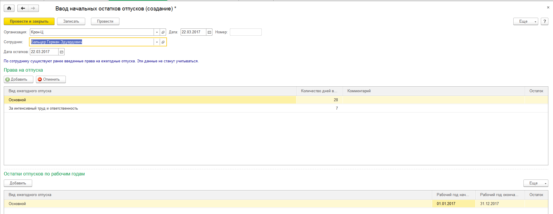 В документе указываем сотрудника и дату, на которые ему вводят остатки отпусков, – дата остатков.