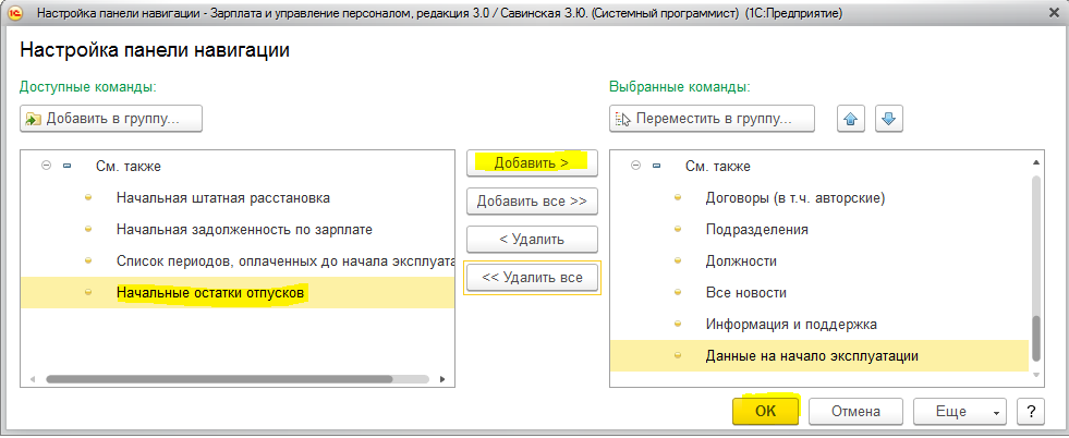 Обратите внимание! Если данный документ отсутствует в разделе, то его можно добавить следующим путем: переходим в раздел «Главное», в правом верхнем углу нажимаем на пиктограмму в виде шестеренок , выбираем «Настройка навигации». Откроется окно «Настройка панели навигации», в левой части «Доступные команды» находим «Начальные остатки отпусков» и переносим в правую часть «Выбранные команды» при помощи кнопки «Добавить». Нажимаем «Ок», и документ появится в панели навигации.