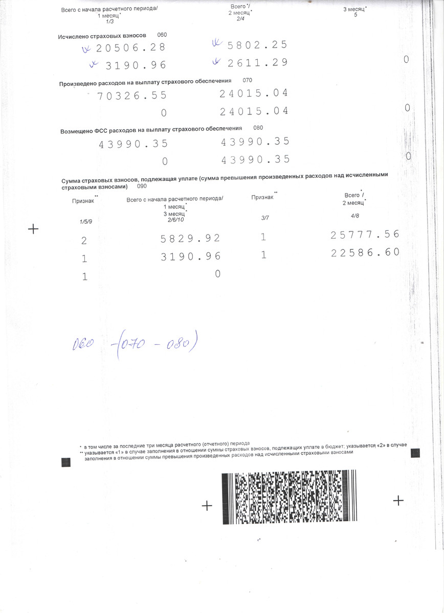 - по строке 020 Приложения 2 (по страховым взносам на обязательное социальное страхование на случай временной нетрудоспособности и в связи с материнством) к разделу 1 Расчета;