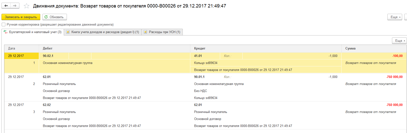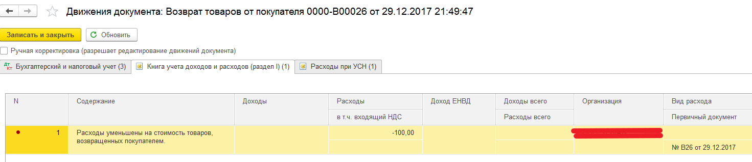 т.е. при проведении документа в Бухгалтерии 3.0 "Возврат от покупателя" в расходы КУДиР попало всего 100 руб. и таких документов несколько в 2015 и 2017 году.