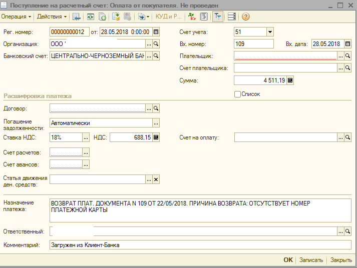 28.05 банк-получатель платёж возвратил. Как этот возврат оформить? Как завести выписку правильно?
