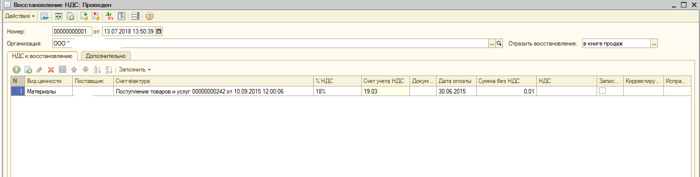 Для 1С8.2 меню Покупка - Ведение книги покупок - Восстановление НДС