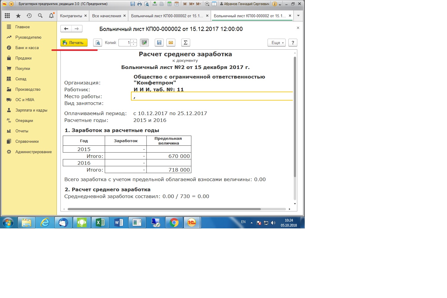 Это расчет среднего заработка, это не то. В болничном листе надо начать на сумму и появится форма с разбивкой по месяцам, с указанием сколько за счет работодателя а сколько за счет фонда. Вот ее надо на печать выводить.