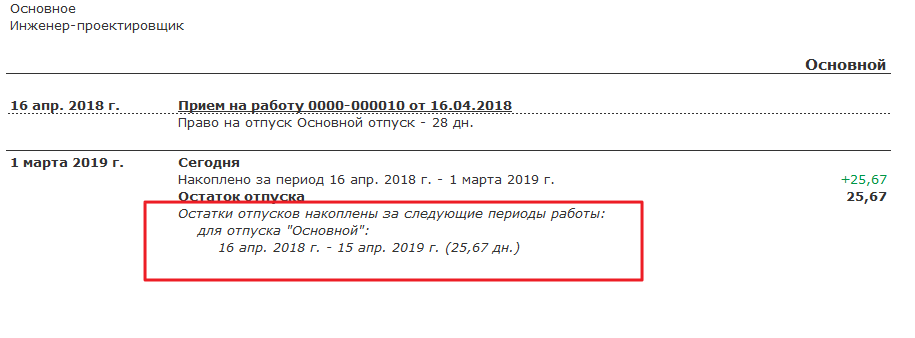 Вот я пишу, что с 25.03.18 по 24.03.19 сотруднику осталось 28 дней отпуска.
