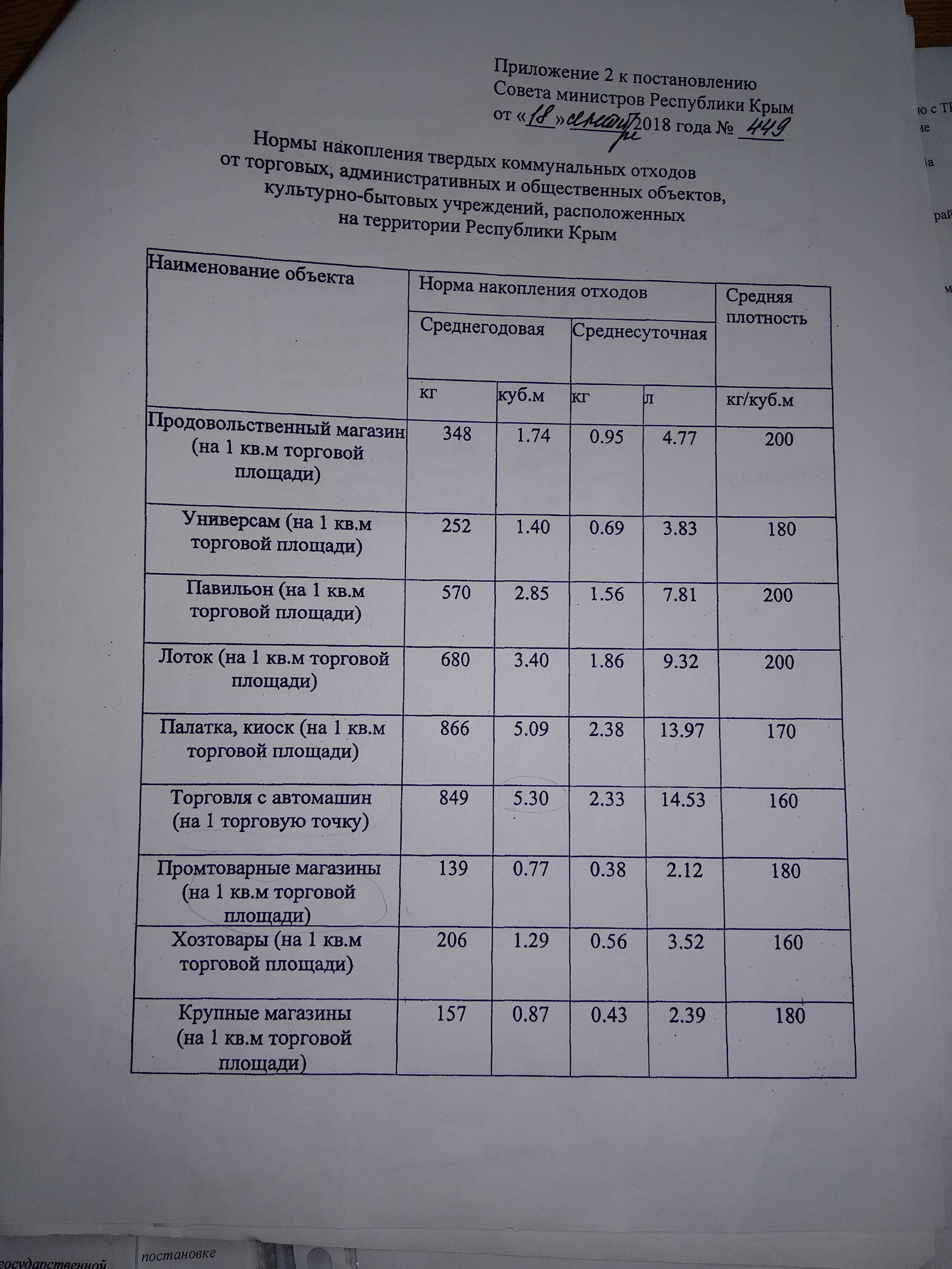 В отделении Крымэкоресурсов озвучили новость, что начисления будут проходить теперь не от торговой площади а от общей, что приведет к увеличению оплаты за вывоз ТКО. На промтоварный магазин площадью 50 м сумма в месяц 1200 рублей. Объем отходов порядка 35 кубов в год!!! Радует как всегда...
