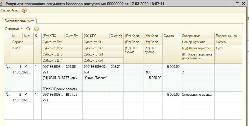 Обратите внимание, в документ была добавлена специализированный флаг «Возврат прошлых лет», при установке которого помимо проводок на балансовых счетах добавляется проводка по забалансовому счету ВПЛ.ХХ «Возвраты прошлых лет».