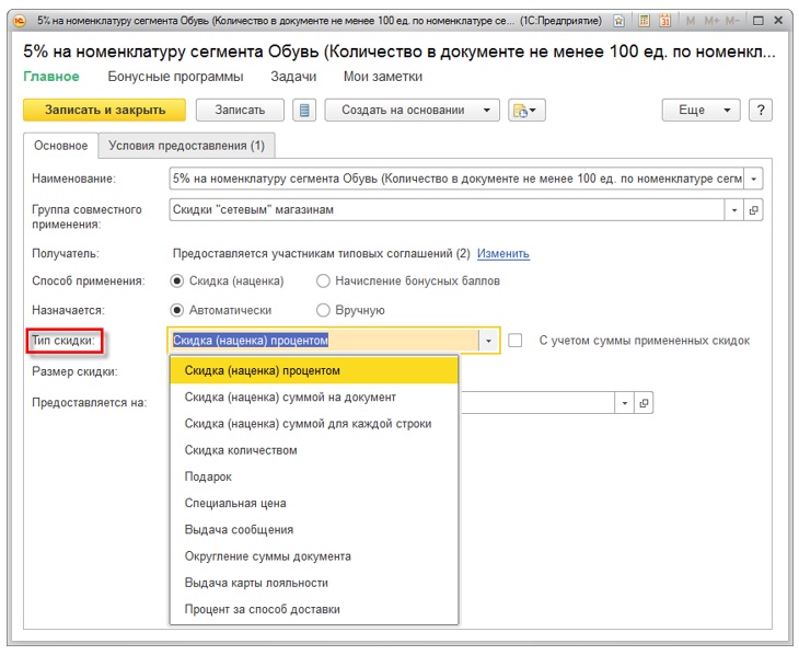 Кроме этого, мы можем предоставлять подарки при покупке на определенных условиях. Например, при покупке определенного сегмента товаров, клиенту в подарок предоставляется другой товар. Такой вариант мы также можем отразить в программе «1С:ERP».