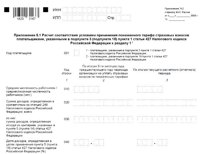 Кроме этого, в раздел 1 добавится новое приложение 5.1 «Расчет соответствия условиям применения пониженного тарифа страховых взносов плательщиками, указанными в пп. 3 (пп. 18) п. 1 ст. 427 НК РФ».