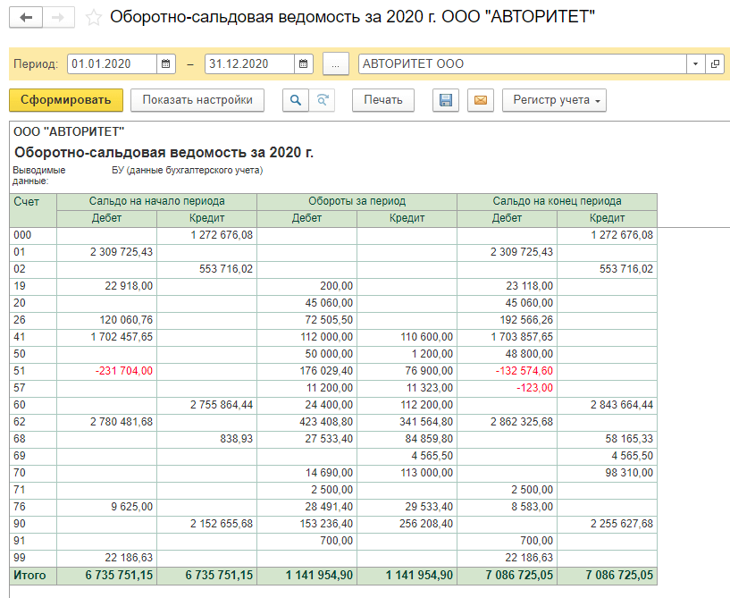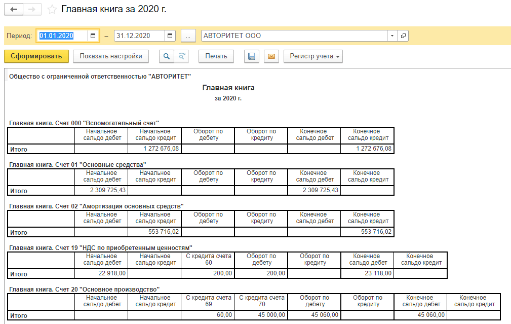 Далее переходим к проверке бухгалтерских регистров: главной книге и оборотно-сальдовой ведомости по всем задействованным счетам бухгалтерского учета. После выполнения всех регламентных операций по закрытию периода (актуализации данных) требуется проверить корректность учетных данных, по которым формируется регламентированная бухгалтерская отчетность.