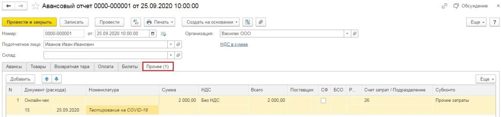 Чтобы отразить расходы, которые необходимо компенсировать сотруднику, создадим документ «Авансовый отчет» (раздел «Банк и касса» – «Авансовый отчет»). При заполнении документа указывается сам работник, который оплатил тестирование, и на вкладке «Прочее» отражаются расходы, понесенные сотрудником.