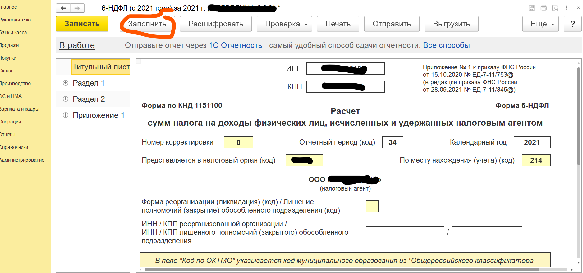 Если в 1-С Отчетности нет 6-НДФЛ с 2021 года, значит программа не обновлена.