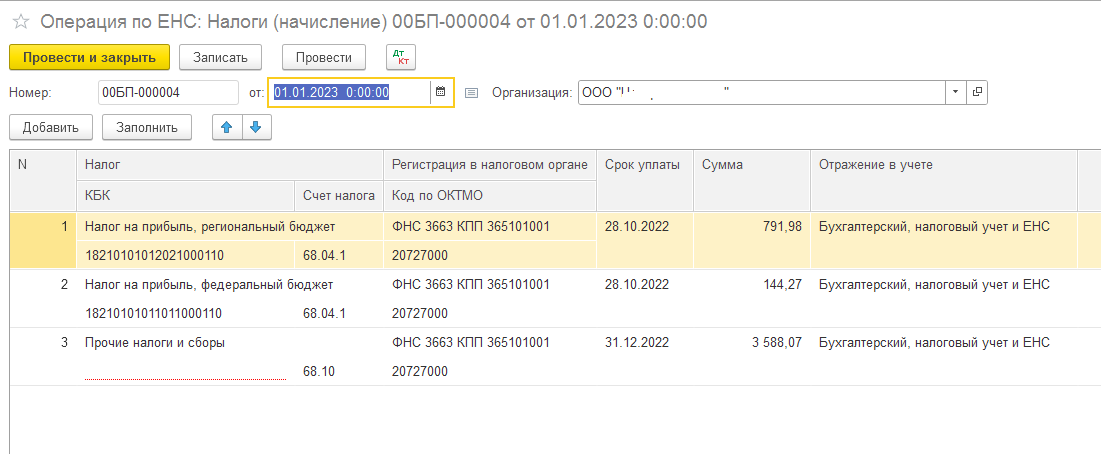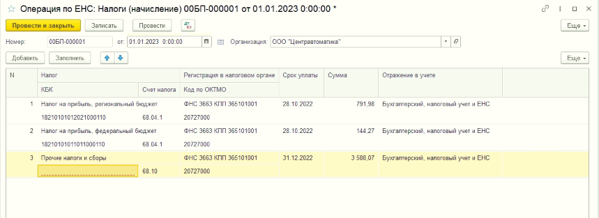 "Операция по ЕНС" с видом "Налоги (начисление)". В табличную часть документа попадут остатки по задолженности перед бюджетом по налогам и взносам на 31.12.2022, которые формируются в следующем порядке:
