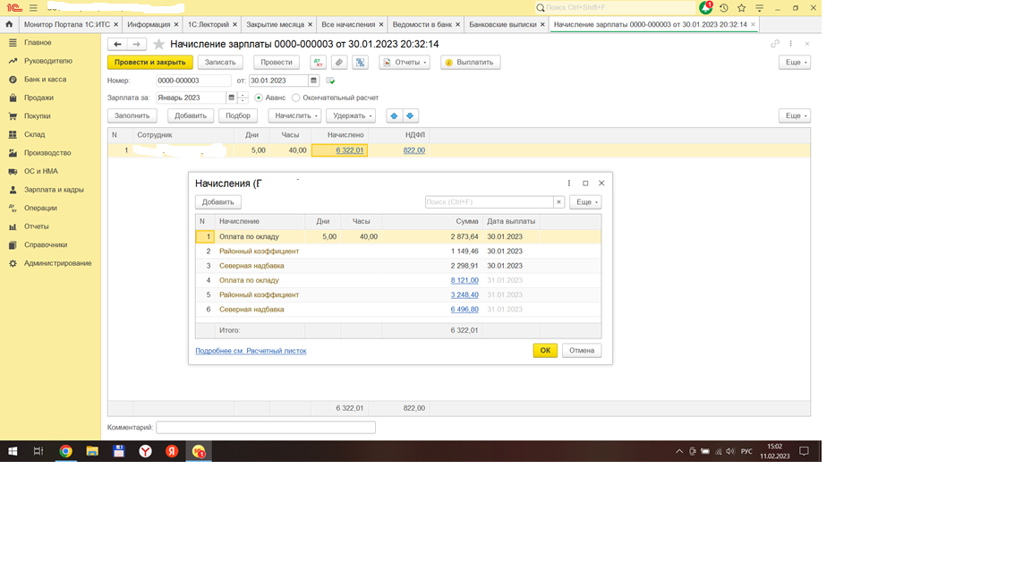 По сотруднику, по которому прилагаю скрины в начислении з/п окончательной, в расшифровке НДФЛ откуда-то взялась дата 02.02.2023 и ндфл (-821).