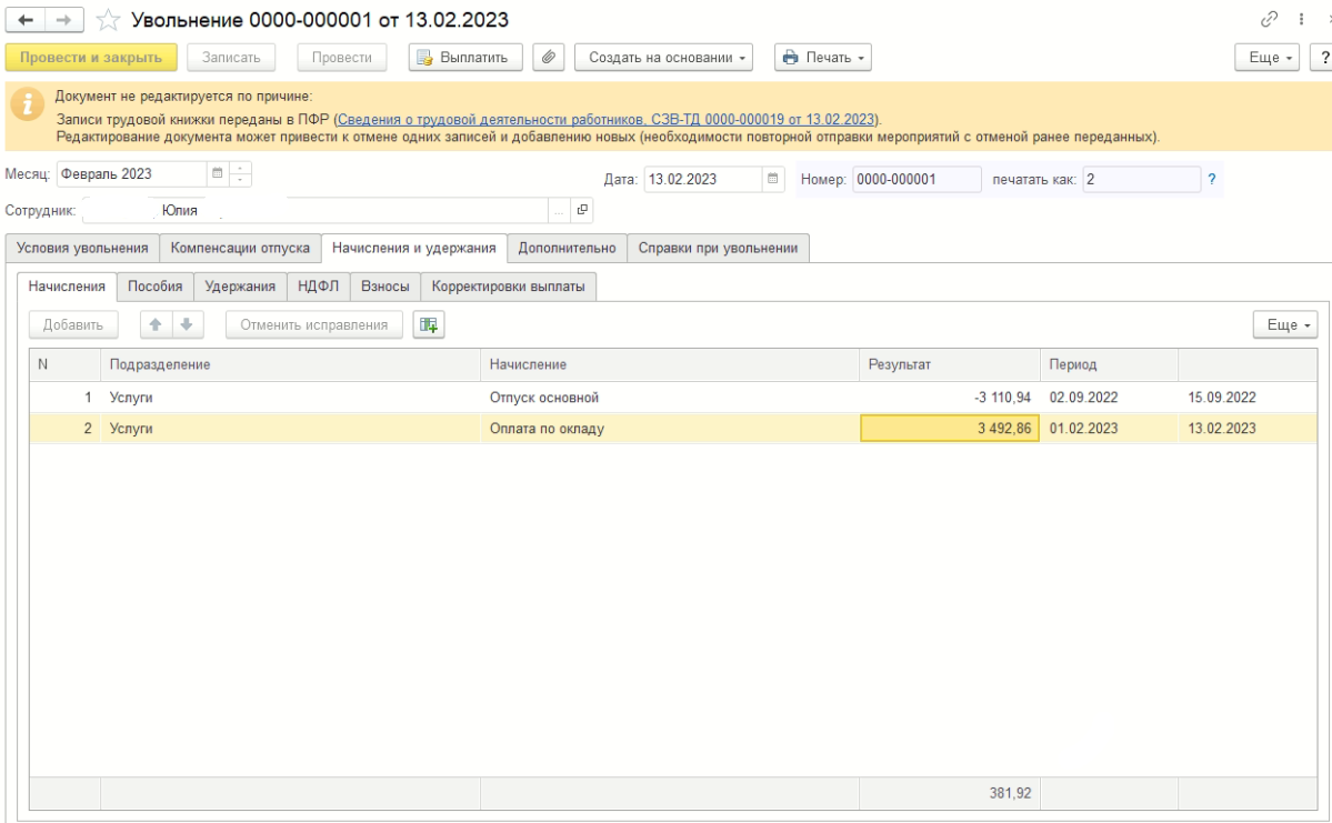 Из того же документа увольнения на вкладке "справки..." я делаю 2-НДФЛ для сотрудника. И там за этот месяц в доходе стоит эта самая разница к выплате. Что логично.