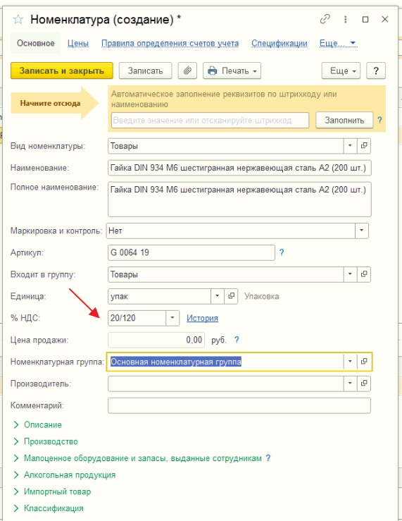 Когда создаю новую номенклатуру (товар, материал), то в карточке по умолчанию стоит ставка НДС 20/120