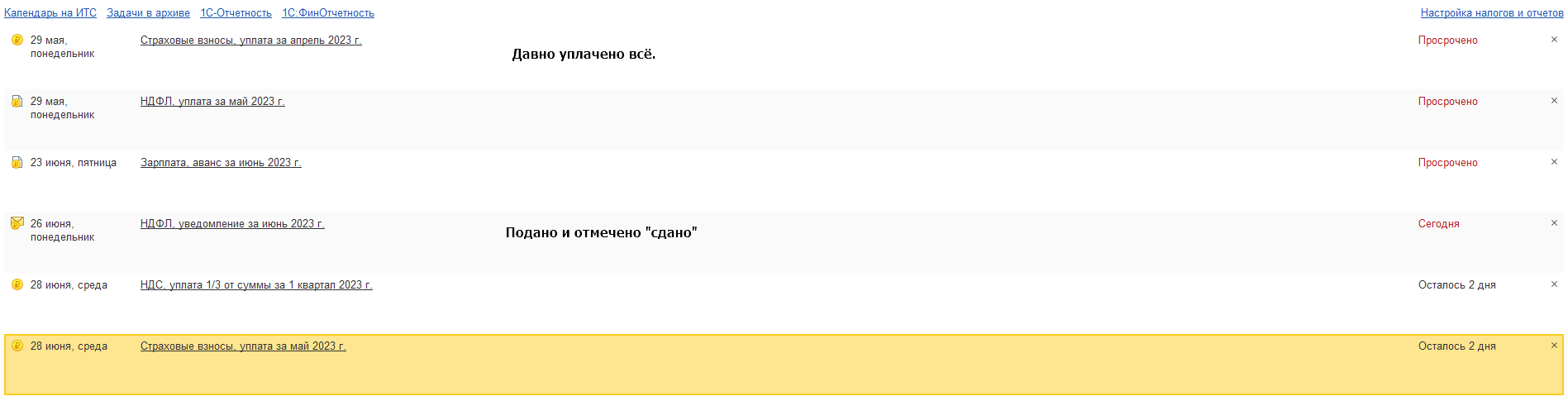 Мне например делать платежки или выплачивать зарплату тоже не удобно через задачи, начисляю зарплату как привыкла, через журнал Зарплата, соответственно ведомости тоже там формирую и платежки делаю как мне удобно, а в задачах, чтобы не бесило, то что висит напоминание, типа что просрочено уже, то просто закидываю в архив и меня не смущает, но закидываю в архив только после того, как уже например выплатила зарплату, а до этого момента висит как напоминалка, вдруг забуду.