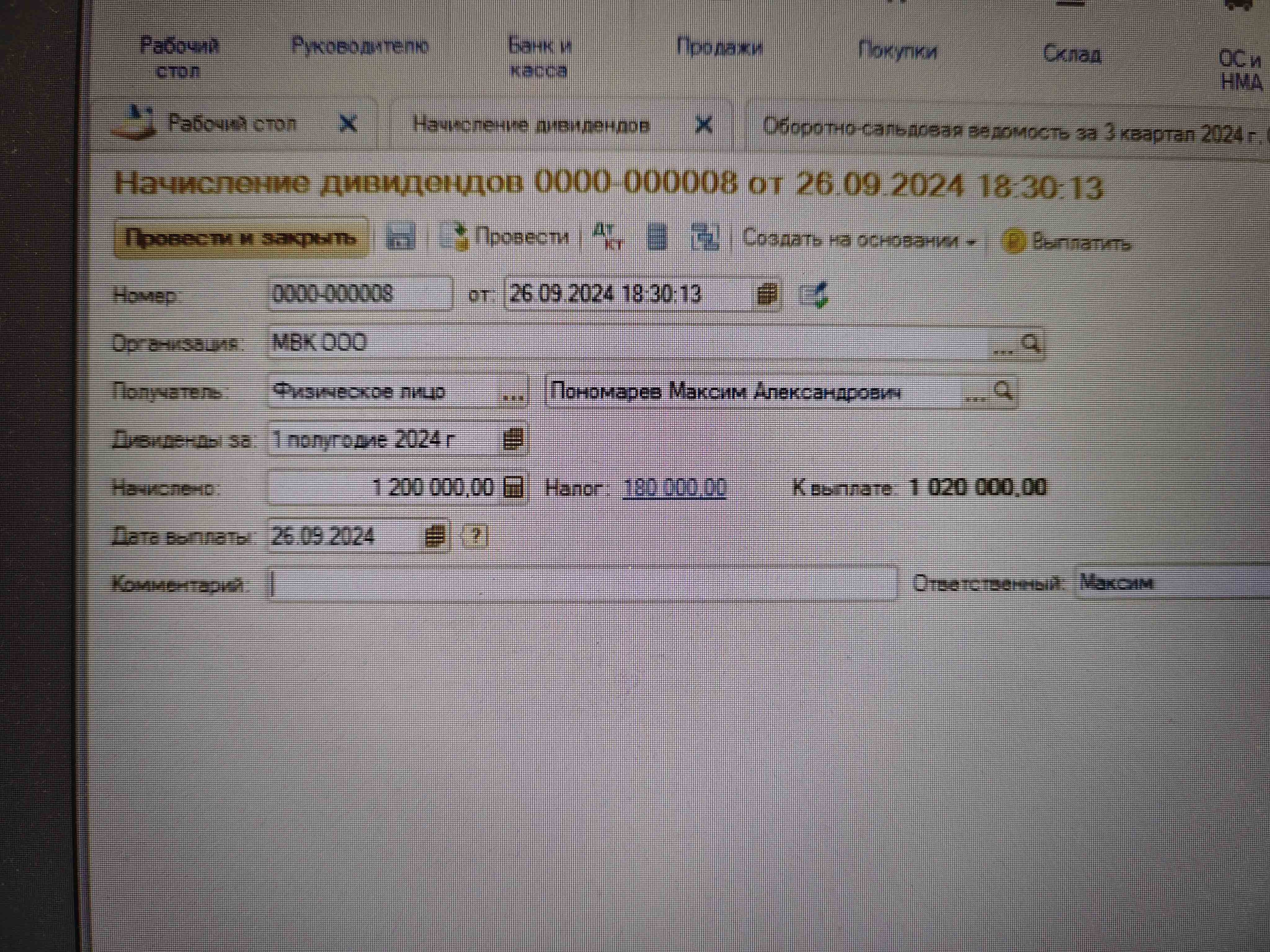 Sima, Видимо программа проставляет автоматически срок уплаты НДФЛ за период с 23 сентября по 30 сентября по последнему дню уплаты, а последний срок уплаты НДФЛ за этот период 7 октября. Поэтому схлопнет только в октябре. Я тоже в сентябре выплачивала дивиденды, но у меня начисление и выплата была в первой половине сентября, 9 начислила, 10 выплатила и программа в выписке проводку в выписке банка делает Дт 75.02 Кт 51 10 сентября, а проводку Дт 68.01.01 Кт 68.90 делает 30 сентября, а это последний день уплаты за период с 1 сен по 22 сен. Налоги уплатила 21 сентября. И несмотря на то, что налоги я уплатила 21 сентября, в оборотке они сидели, как в переплате по Дт 68.90 схлопнулись только после 30 числа, по последнему сроку уплаты.