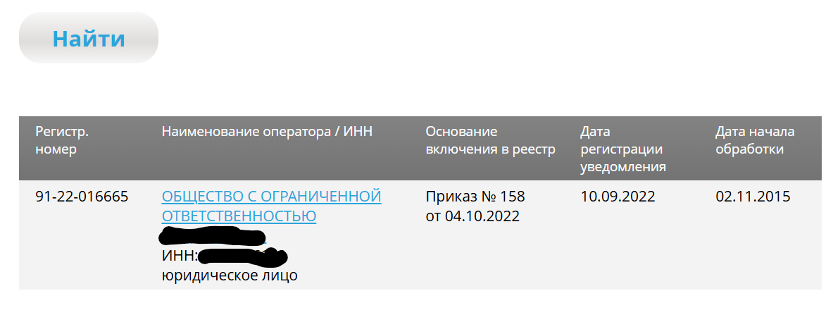 Провалилась в название организации и выдало само Уведомление, на основании которого предприятие включено в Реестр операторов.