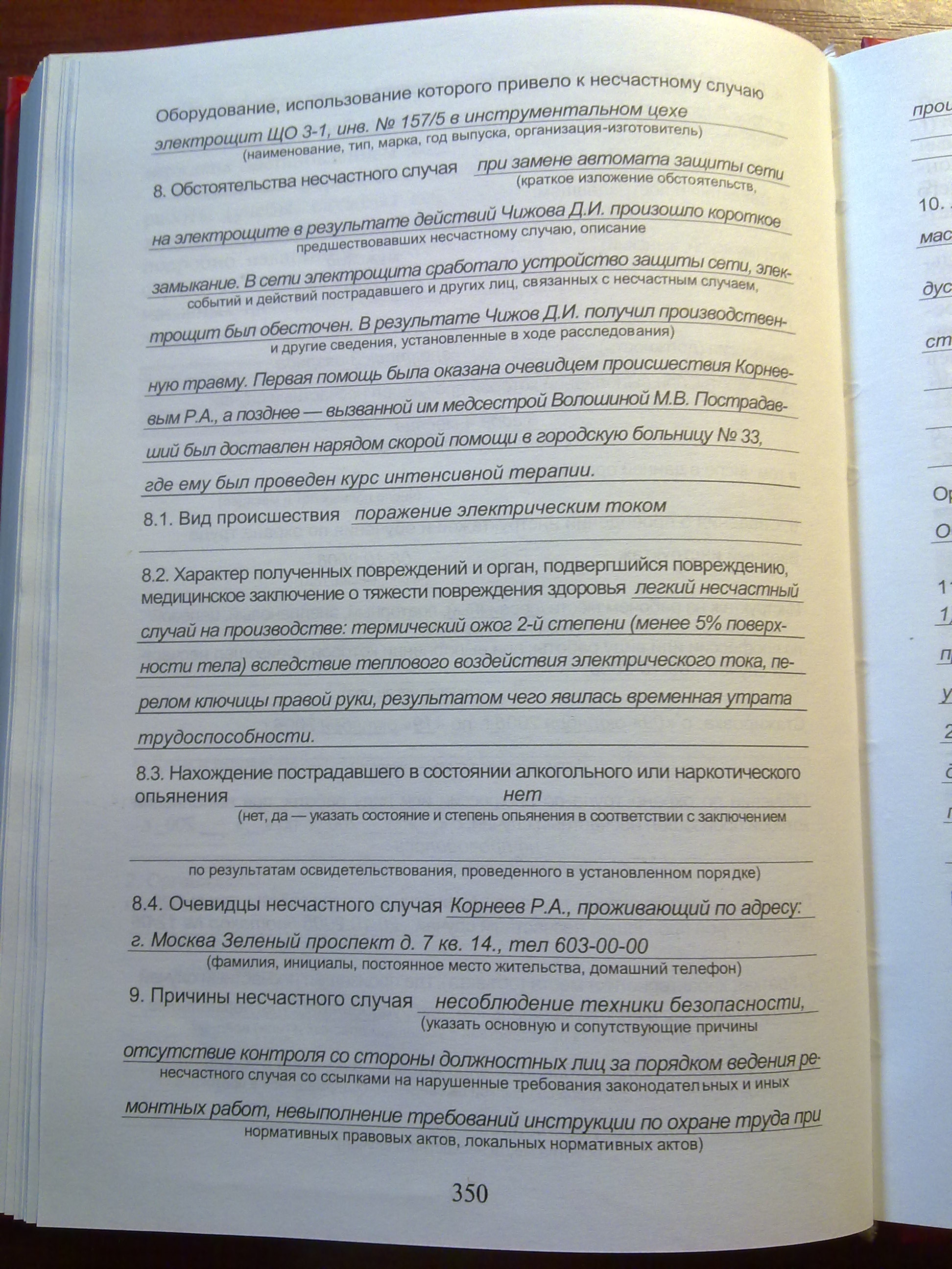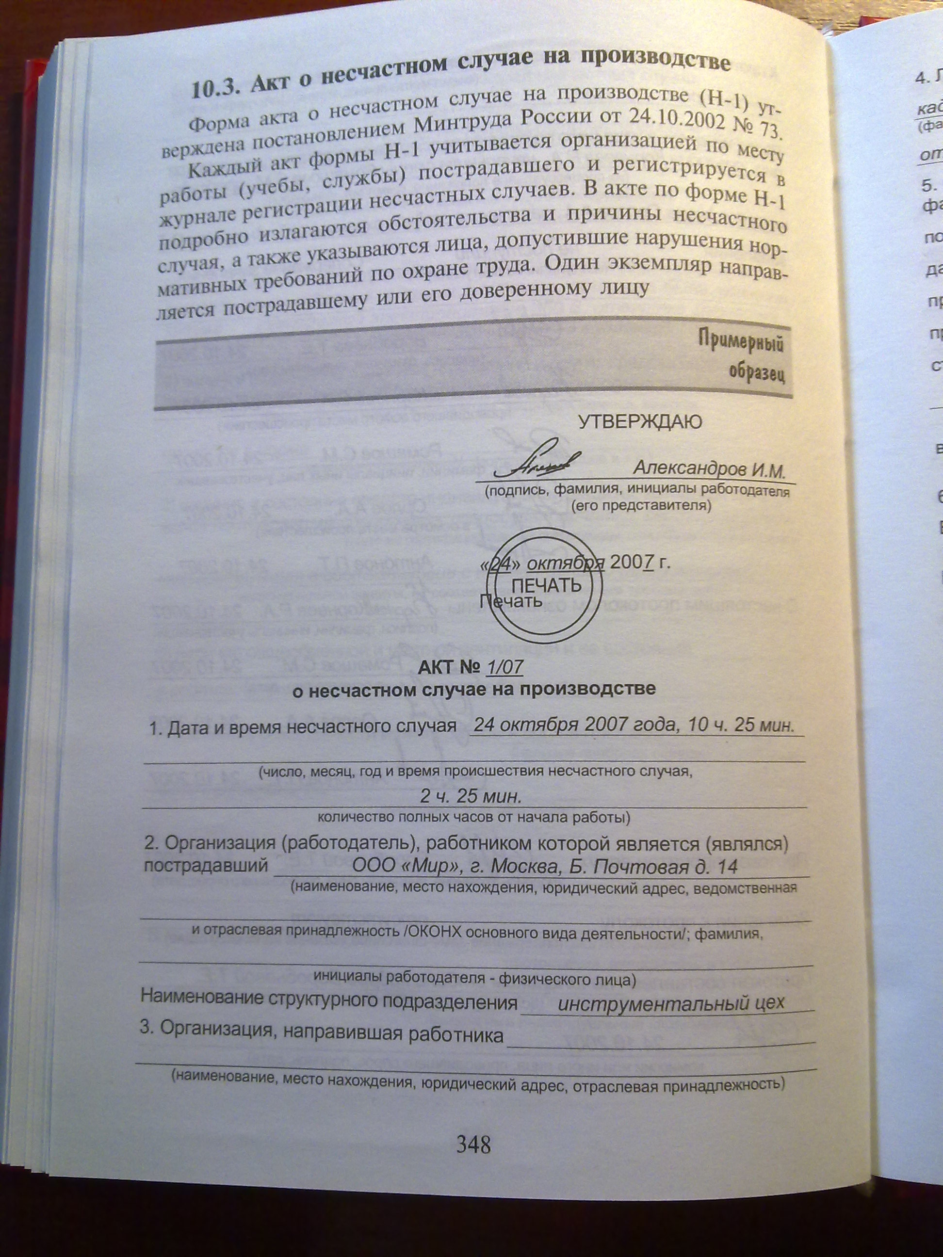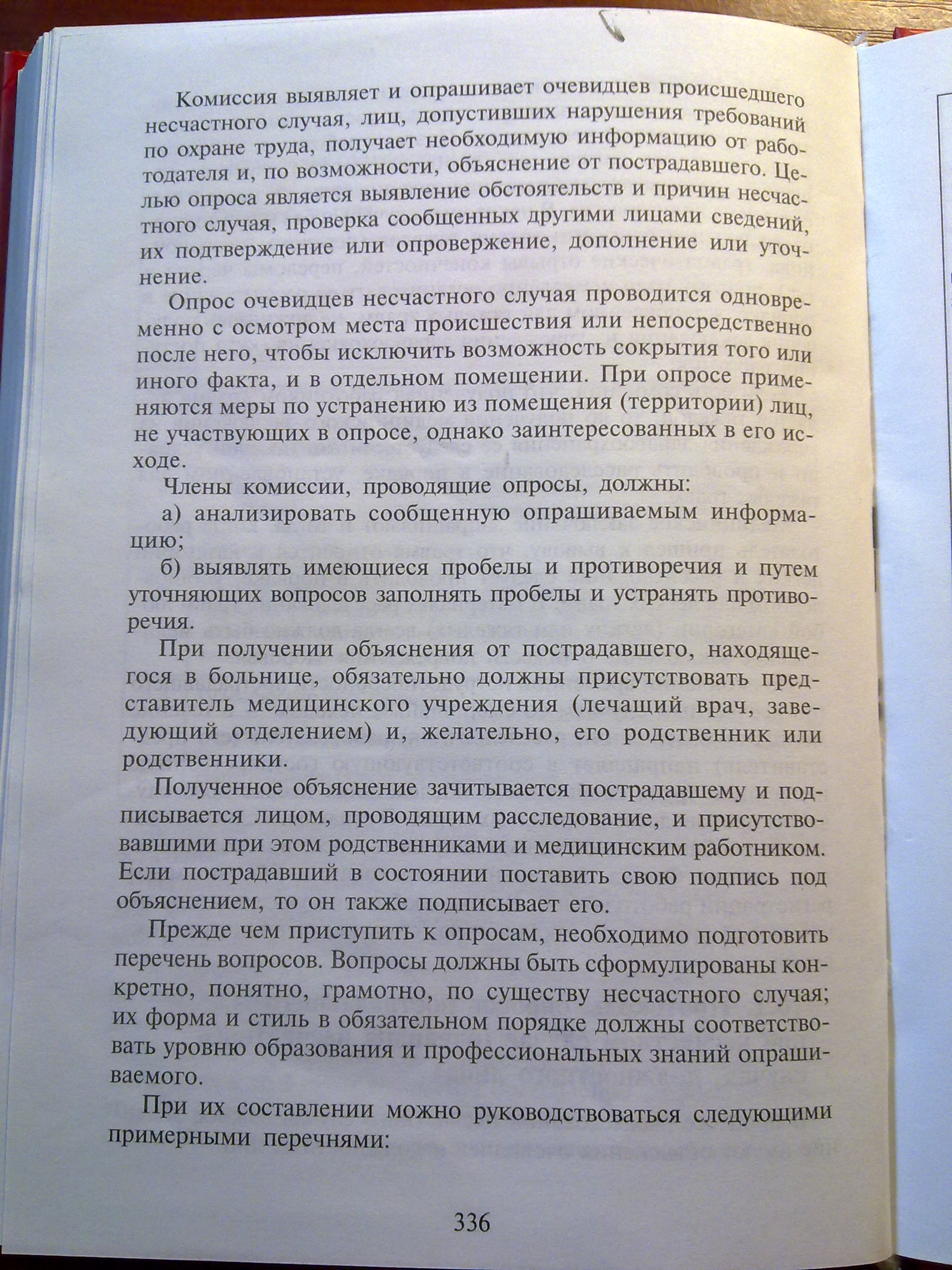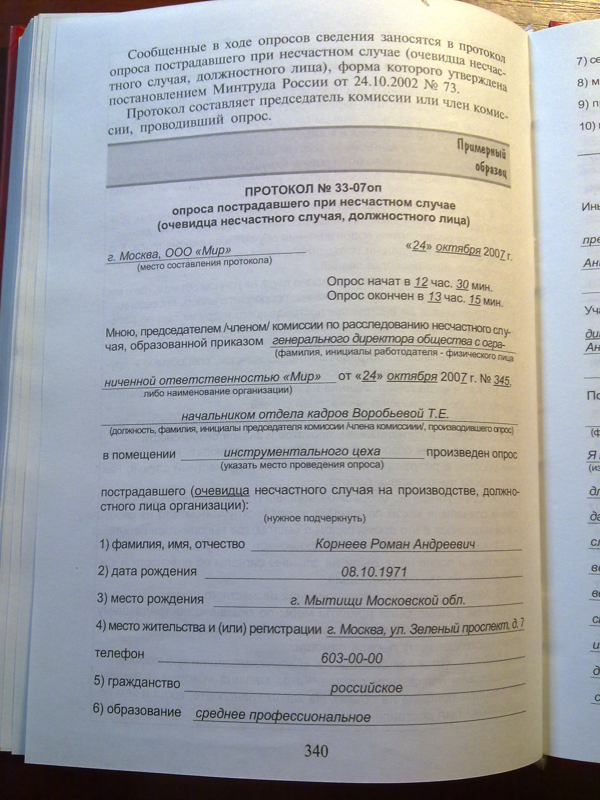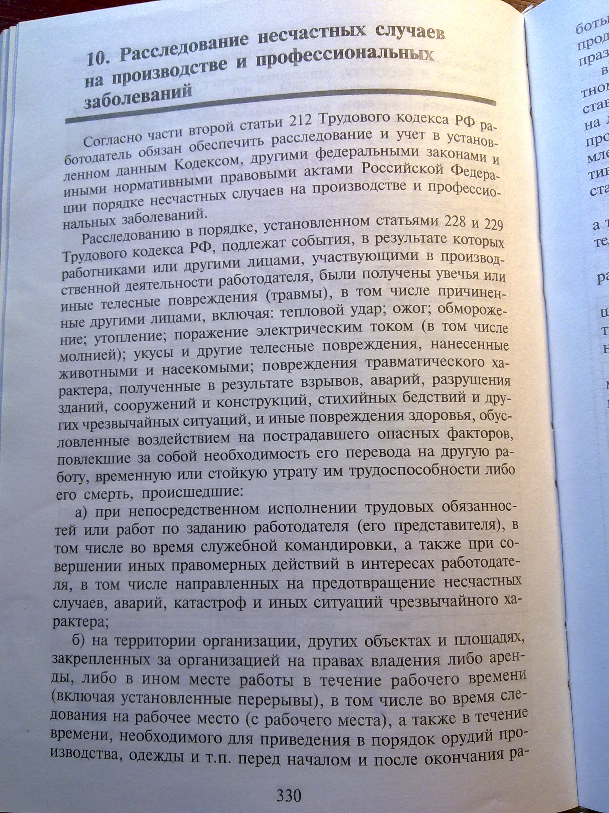Таинственная Незнакомка, у меня есть книга, где очень подробно с описанием и примерами приведено расследование НС на производстве, вплоть до того как опрашивать пострадавшего, очевидцев и проч., даже бланки для образца заполнены. Если нужно сфоткаю и тебе перешлю. И еще. У меня был такой случай на производстве, довольно серьезный, человеку стружка металлическая в глаз отлетела и засела очень глубоко. Лежал в больнице, думали, что даже могут сделать операцию, но слава Богу, обошлось. Я все составила, но ни инспекцию, ни другие инстанции не оповещала, проблем не было.