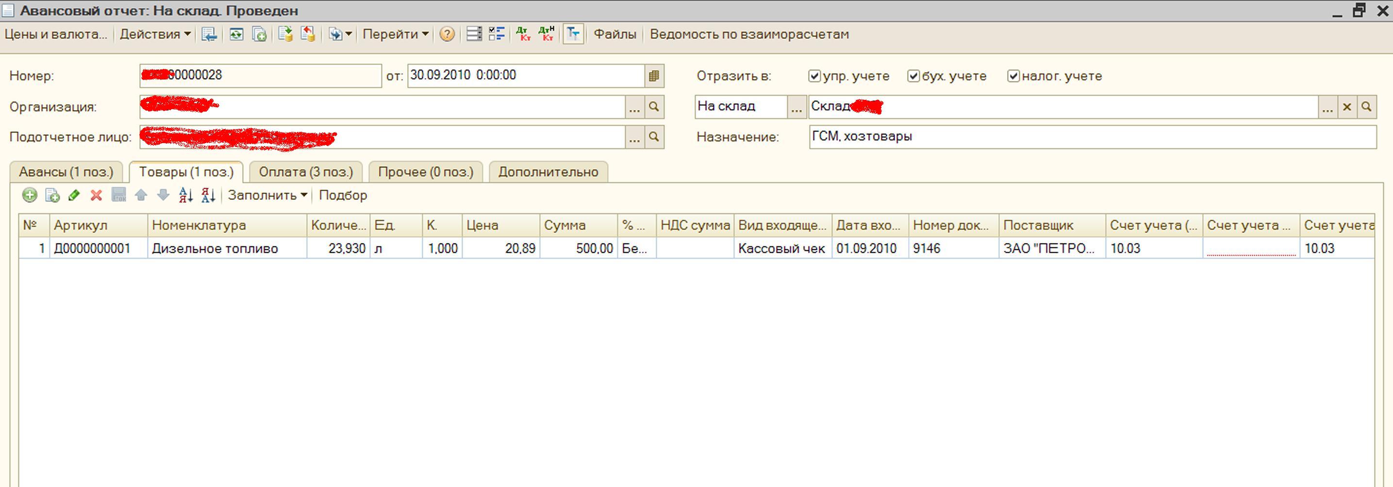 если подотчетник принес чек ККМ, товарный... за товар (например ГСМ, канцтовары и т.д.) заполняете вкладку ТОВАР,