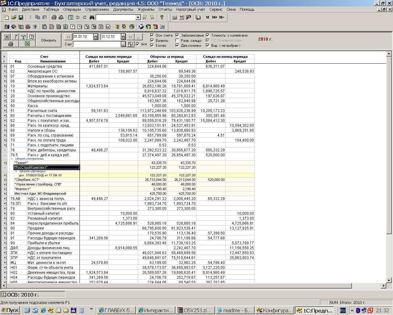 Я приложил экран, где в этой ОСВ развернул счет 76 по субсчетам, потом субсчет 76.5 развернул по контрагентам, а затем одного из контрагентов развернул по договорам (правда, у него был только один договор).