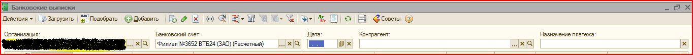 Когда делаю выписку из банка в программе 1с платформа 8.2 - программа мне выдают, что введенные данные не отображаются в списке, так как не соответствуют отбору! Что это может быть!