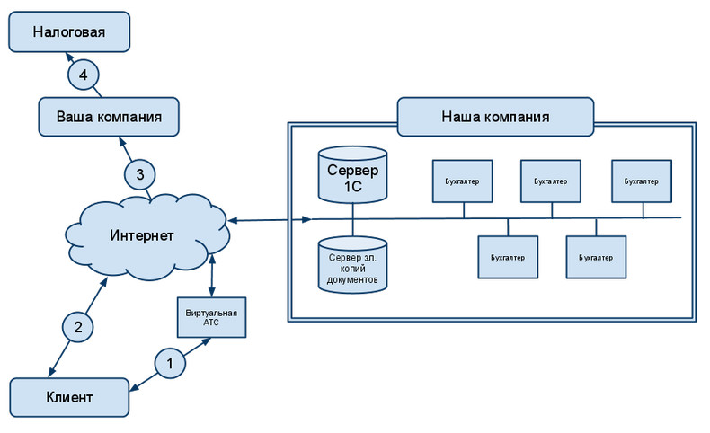 1. Клиент звонит на московский номер, набирает добавочный и попадает на бухгалтера, который его обслуживает.