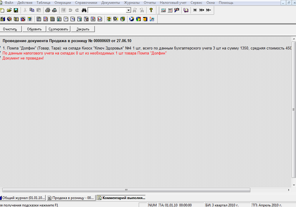 "Проведение документа Продажа в розницу № 00000669 от 27.06.10 1. Помпа "Долфин" (Товар, Тара): на складе Киоск "Ключ Здоровья" №4 1 шт, всего по данным бухгалтерского учета 3 шт на сумму 1350, средняя стоимость 450 По данным налогового учета на складах 0 шт из необходимых 1 шт товара Помпа "Долфин" Документ не проведен!" И не можем разобраться почему. Может кто-то сталкивался с такой проблемой? Спасибо! P.S. Во вложении скриншот. |