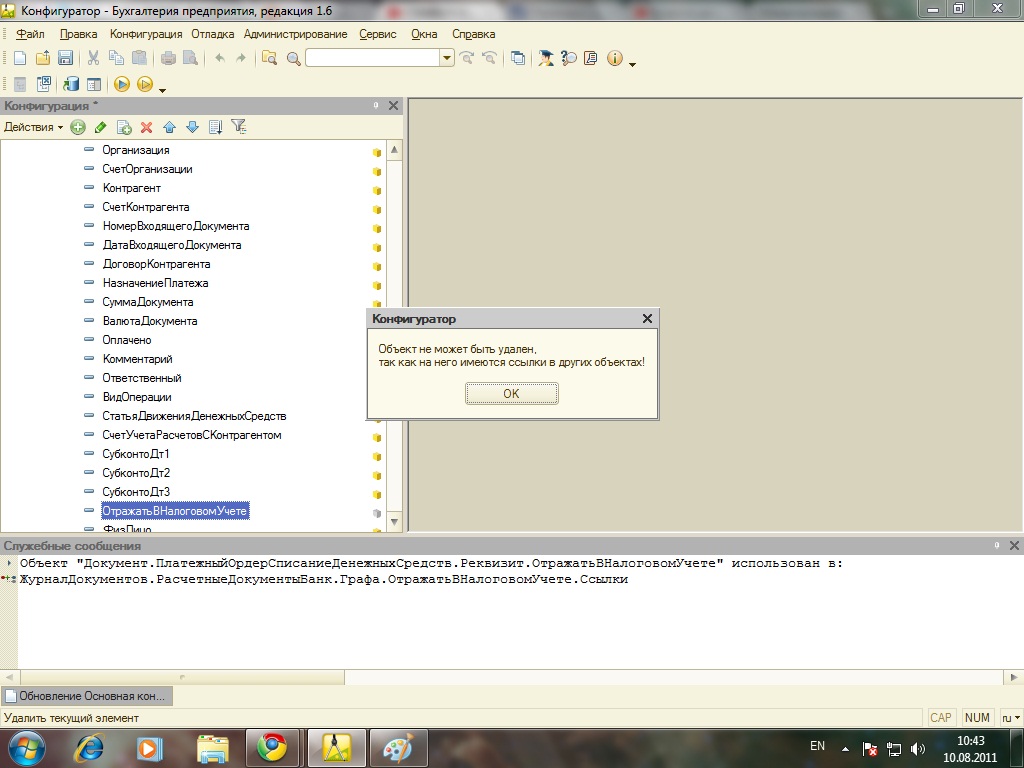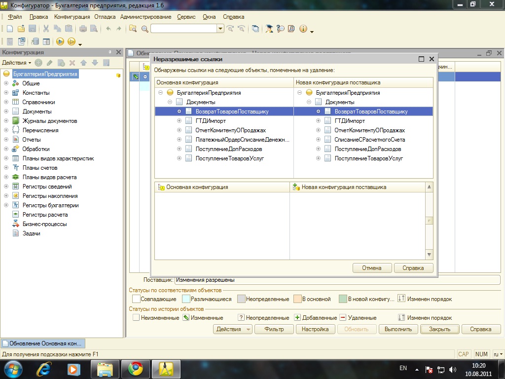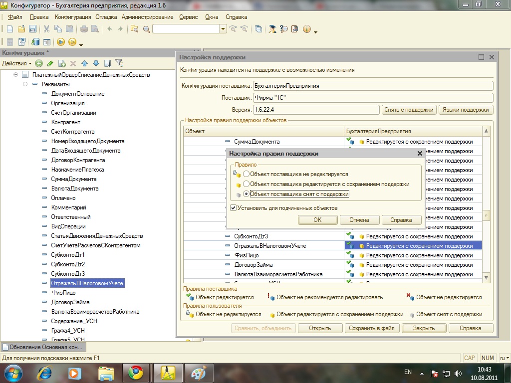 Вот сегодня столкнулся с тем же (см 1 сообщение) Жалуется на реквизит "ОтражатьВНалоговомУчете". Вышел из положения: Удалил в Конфигураторе , только перед этим надо снять с поддержки этот реквизит (ОтражатьВНалоговомУчете) через меню "Конфигурация/Поддержка/Настройка поддержки..." далее выбираем документ и в нем реквизит Если выйдет служебное сообщение тогда реквизит удаляем сначала в журнале и только потом в документе. Вдруг кому пригодится