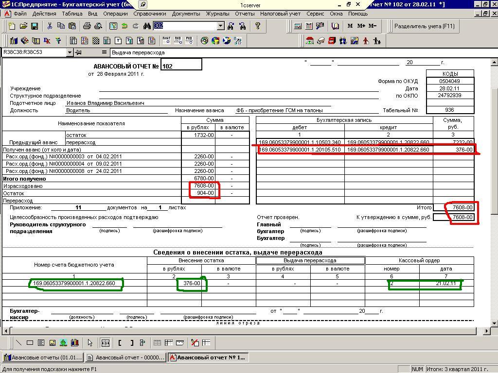 в прошлый авансовый , где обнаружился остаток 1732 рубля, нужно всунуть остаток внесен в кассу 376 руб.