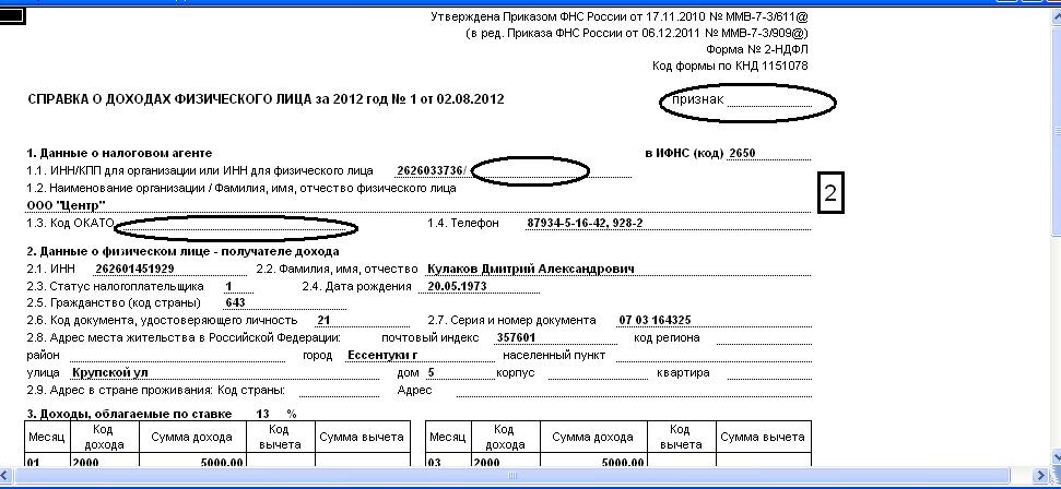 1. Справочники - Налоги - Налоги и отчисления - НДФЛ - указать ОКАТО (состоит из 11 цифр, например 452 965 05 000 - последние обычно 3 нуля) 2. Справочники - Сотрудники - установить курсор на нужного - нажать внизу кнопку Налоги на доходы - Корректировка данных по ндфл - выбрать 2011 год заполнить и сохранить (и так для всех работавших в 2011 году сотрудников) 3. Отчеты - Специализированные - Справки по ндфл - заполнить и сформировать Рекоммендуется осуществлять формирование из последнего релиза (на сегодняшний день бух-7.70.537, усн - 7.70.191) даже если буду печать из справочника сотрудники по конкретному лицу картина не меняется |