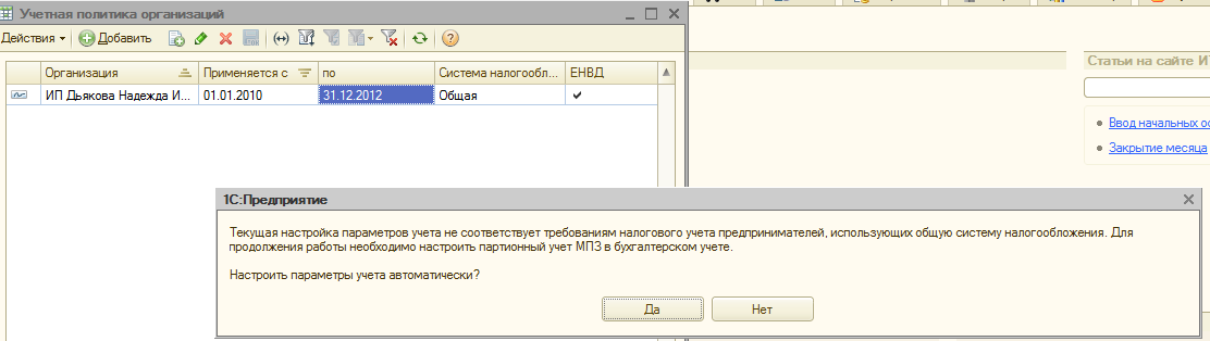 В миниатюре посерединке выдается вот это при КЛИКЕ НА "НАСТРОЙКИ УЧЕТНОЙ ПОЛИТИКИ". Выбираю НЕТ, а далее картинка номер 3: почему-то поле ОРГАНИЗАЦИЯ ОЧИЩЕНО. Пытаюсь вставить в поле нужную организацию ИП на УСН. В итоге опять предлагается "настроить параметры учета автоматически" (см.миниатюру посередине). Кликаю НЕТ - и опять поле ОРГАНИЗАЦИЯ стерто. И так по замкнутому кругу :(