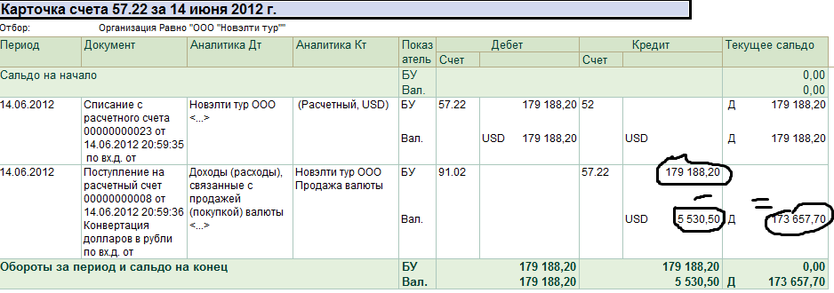 И ещё смотрите, что получилось в оборотке 57 счета: из рублевой суммы 179188,20 почему-то вычтена сумма в долларах 5530,50!