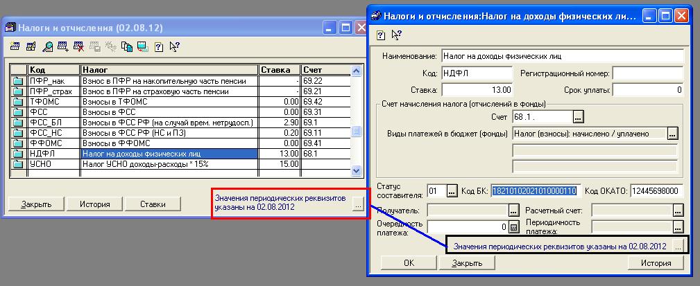 кате по, вы как-то не таК устанавливаете дату для значения периодических элементов.Откройте страничку с налогом,там,где вводится КБК,а не открывайте историю значений.Измените дату на начало года ,введите ОКАТО и нажмите ОК.