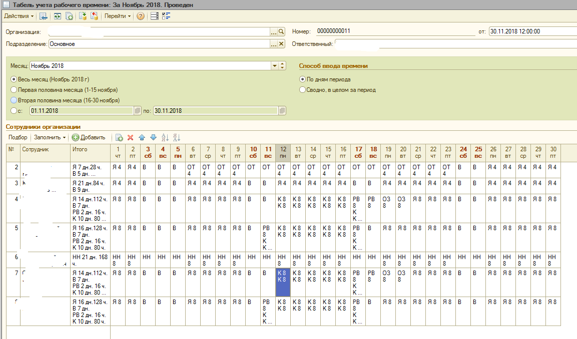 Однако, если вывести табель на печать, то там в клетках только "К" одна даже без восьмерки.