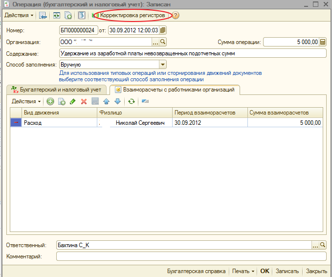 Извините, тема старая, но возникла такая же ситуация. Как это сделать ? Только недавно начали работать в 1С БП 8.2. регситр "Взаиморасчеты с работниками предприятия" нашла. А как внести изменения? И не могу найти документ "Корректировка записей регитсров"
