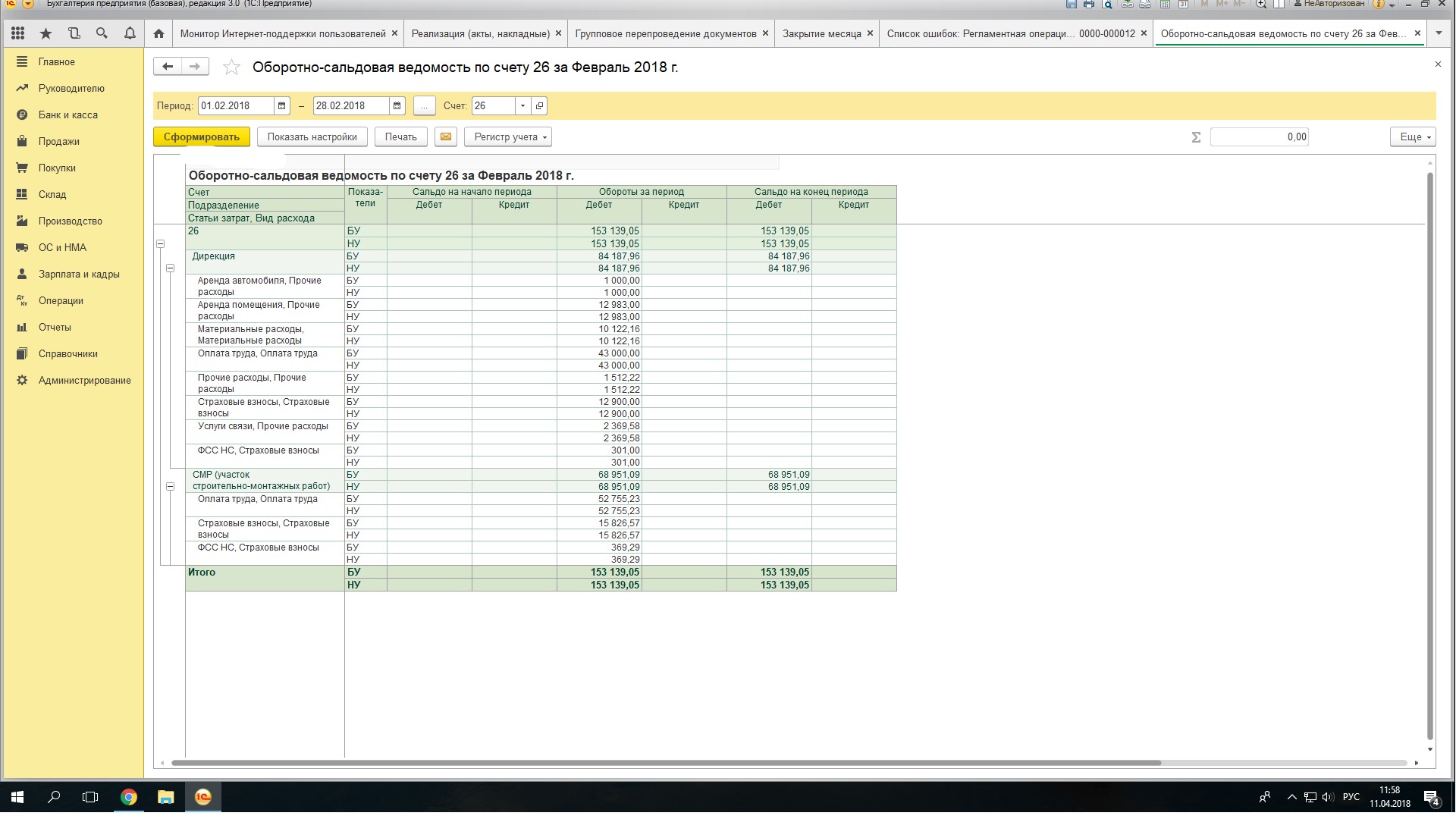 Entry, когда делаешь общую ОСВ то никакого начального сальдо на 26 счете нет, а когда делаешь оборотку по 26 счету непосредственно выползает сальдо на начало периода. Поэтому если этот остаток и был, то в общей оборотке я его не видела. ОСВ по 26 счету необходимости не было делать-все нормально списывалось. НО опять же повторюсь если бы он был ну я никак бы не смогла закрыть месяцы начиная с 2012 года.