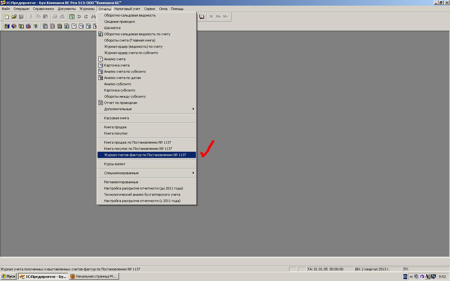 главное меню -> меню отчеты -> журнал счетов фактур по постановлению №1137, на снимке экрана s1.jpg. После нажатия этого меню возникала ошибка показанная на снимке экрана s2.jpg, и довольно длительное время работа в 1С велась с это ошибкой.