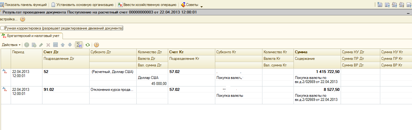Вначале покупаем валюту. Проводки, которые получились, я тоже выложила.