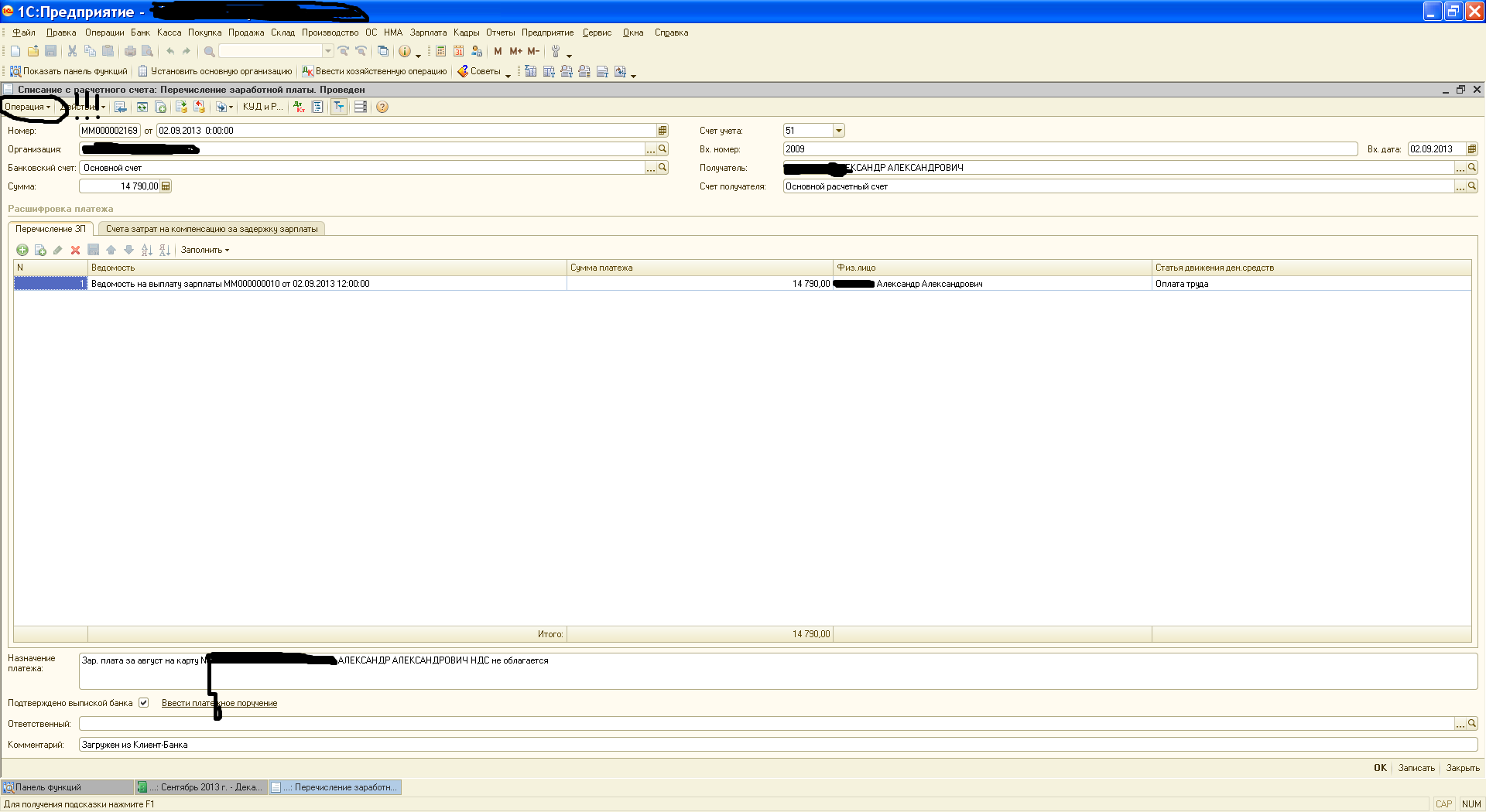 Уважаемые форумчане,всем доброго вечера!Я уже поднимала этот вопрос на форуме и вроде бы все поняла,но сейчас появилась возможность выплачивать зарплату,а у меня ничего не получилось.Подскажите,что я делаю не так (на месяц не обращайте внимания,выплачивать будем только с октября).Делаю выплату аванса 15.09.13,сумму забиваю руками.На основании ведомости провожу платежку и списание с р/сч.Дает проводку: