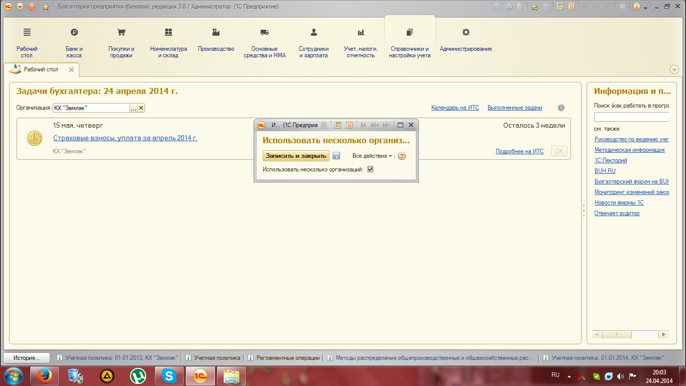 На данный момент у меня 4 организации - 3 крестьянских хозяйства и 1 ООО - торговля. Да это не проблема, в каждой информационной базе своя настройка, ведь в базовой версии возможно ведение только 1 организации в каждой базе. Даже если бы была не базовая, то в одной инфобазе можно всегда настроить учетную политику для каждой организации по отдельности.