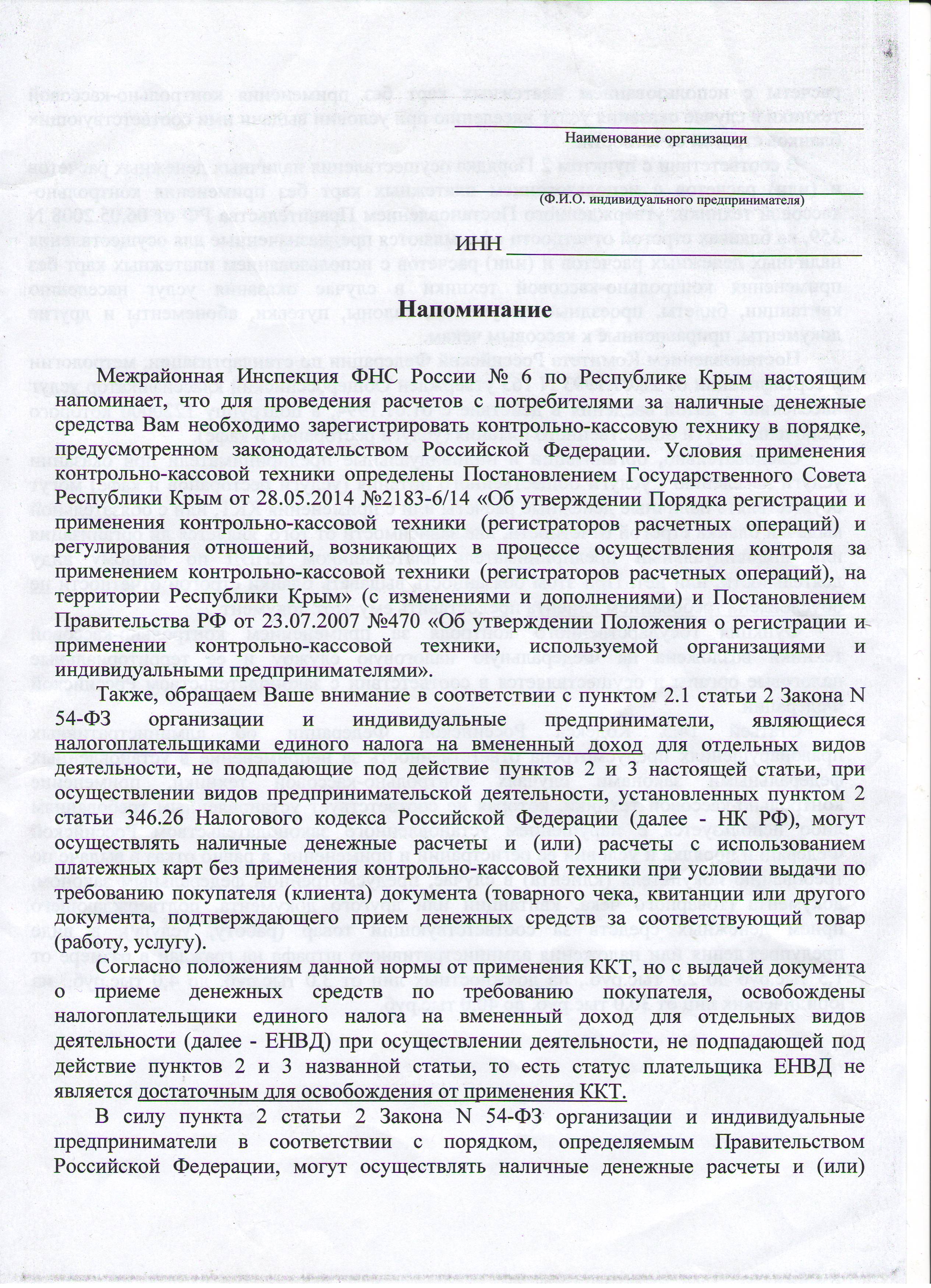 2.1. Организации и индивидуальные предприниматели, являющиеся налогоплательщиками единого налога на вмененный доход для отдельных видов деятельности, при осуществлении видов предпринимательской деятельности, установленных пунктом 2 статьи 346.26 Налогового кодекса Российской Федерации, и индивидуальные предприниматели, являющиеся налогоплательщиками, применяющими патентную систему налогообложения, при осуществлении видов предпринимательской деятельности, в отношении которых законами субъектов Российской Федерации предусмотрено применение патентной системы налогообложения, и не подпадающие под действие пунктов 2 и 3 настоящей статьи, могут осуществлять наличные денежные расчеты и (или) расчеты с использованием платежных карт без применения контрольно-кассовой техники при условии выдачи по требованию покупателя (клиента) документа (товарного чека, квитанции или другого документа, подтверждающего прием денежных средств за соответствующий товар (работу, услугу). Указанный документ выдается в момент оплаты товара (работы, услуги) и должен содержать следующие сведения: