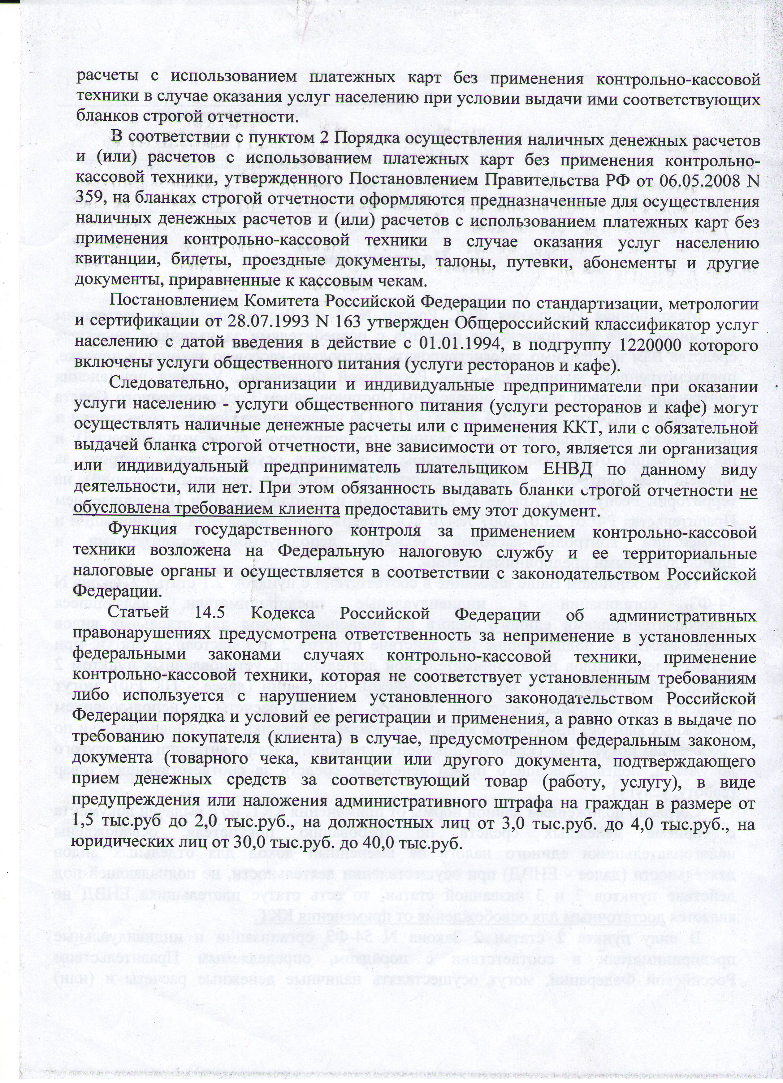 При этом довод налогового органа о том, что положения п. 2.1 ст. 2 Закона о ККТ не распространяются на сферу оказания услуг, не был принят судом апелляционной инстанции на таком основании: в названной норме сказано, что документ должен подтверждать прием денежных средств, включая оплату соответствующей услуги. Данный документ не являлся БСО, оформляемым в соответствии с Положением об осуществлении наличных денежных расчетов и (или) расчетов с использованием платежных карт без применения ККТ (утв. Постановлением Правительства РФ от 06.05.2008 N 359).