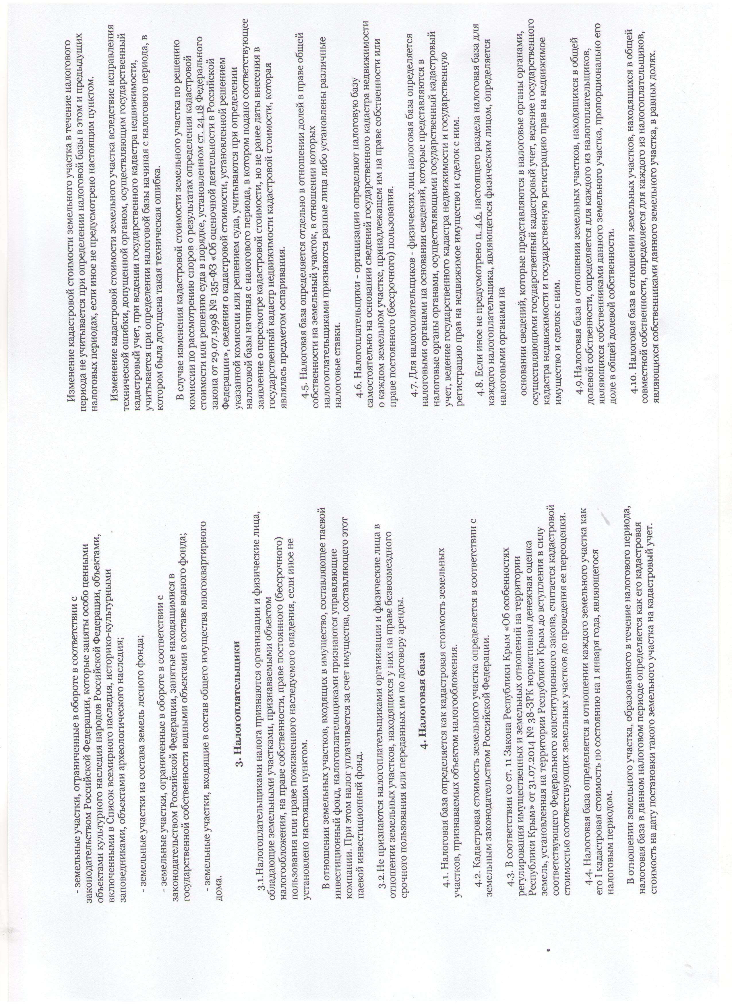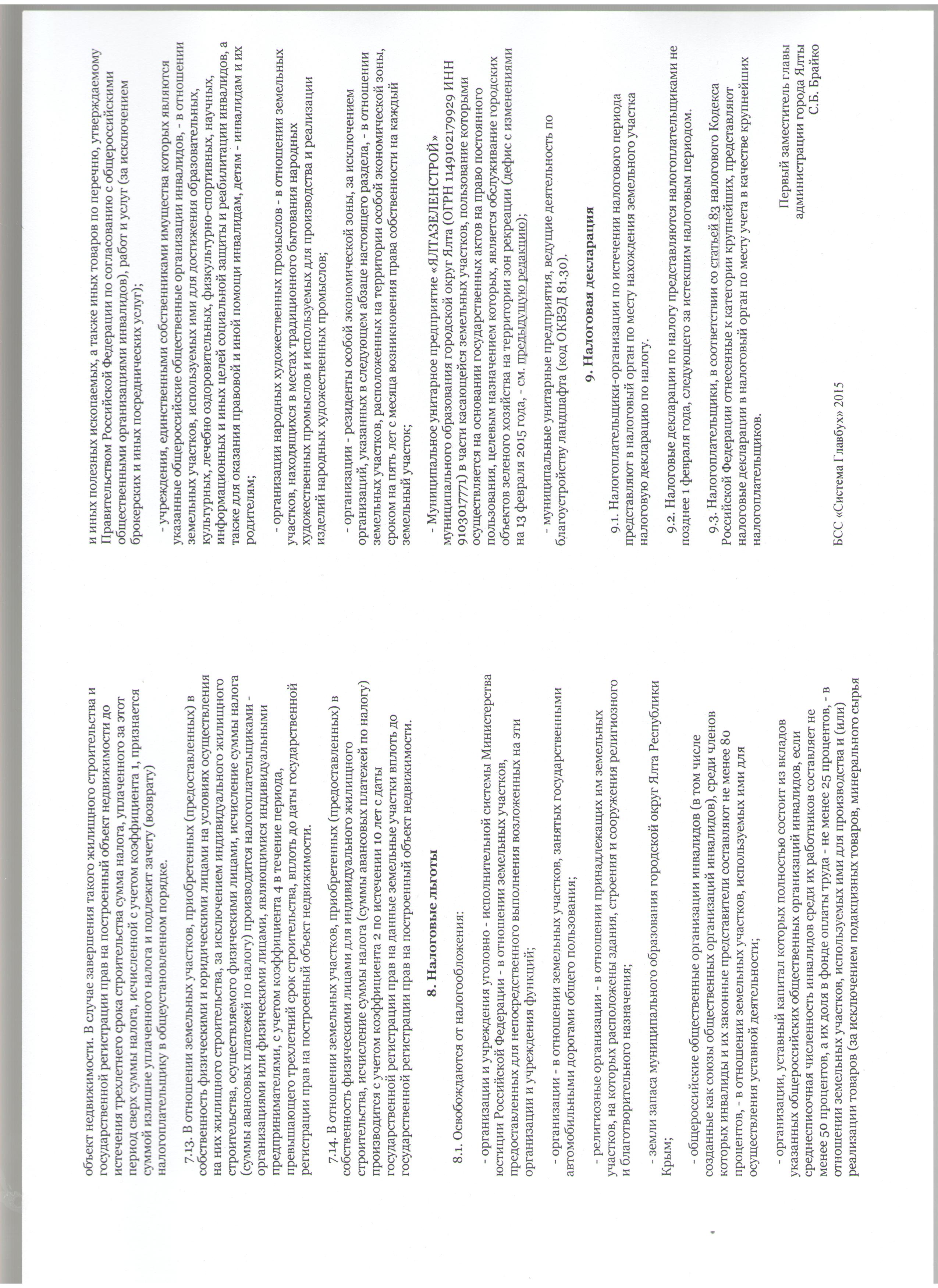 Коллеги, вот информация, которая лично для меня была очень нужна. По налогу на землю.Решение Ялтинского городского совета РК от 26.12.2014 № 229 "Об установлении земельного налога на территории муниципального образования городской округ Ялта (с изменениями на 13 февраля 2015г) Налоговая ставка 1.5% от нормативной денежной оценки для прочих участков.