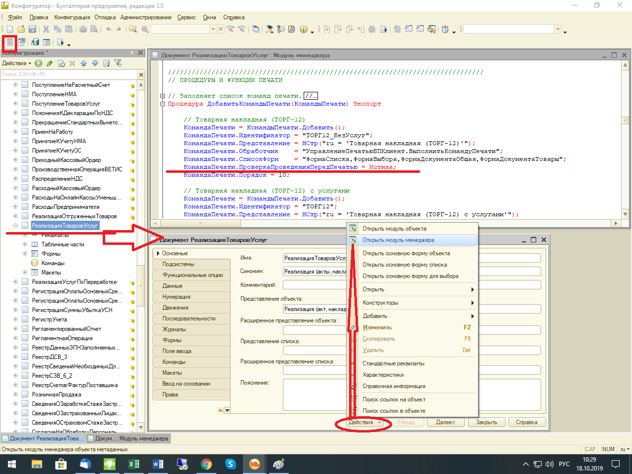 - Запускаем базу в Конфигураторе. - Конфигурация/ Открыть конфигурацию - Конфигурация/ Поддержка/ Настройка поддержки - Включить возможность изменения (соглашаемся продолжить) и в верхнем блоке "Изменения разрешены" выбираем пункт "Объект поставщика редактируется с сохранением поддержки". ОК. немного ждем .. Закрываем окно. - Слева появляется дерево конфигурации, раскрываем группу Документы (слева плюсик), находим нужный нам документ "Реализация товаров и услуг" и дважды кликаем по нему. Откроется окно управления этим документом. - Действия/ Открыть модуль менеджера .. спускаемся вниз, ищем "// ПРОЦЕДУРЫ И ФУНКЦИИ ПЕЧАТИ". - раскрываем плюсик у "Процедура ДобавитьКомандыПечати(КомандыПечати) Экспорт". Здесь будут все возможные печатные формы для нашего документа. - для нужной печатной формы добавляем строку "КомандаПечати.ПроверкаПроведенияПередПечатью = Истина;" - смотри на скрин как добавила. - Конфигурация/ Обновить конфигурацию базы данных Проверяем печать) У меня получилось ![]() Обновление типовое в пользовательском режиме конечно всё это снесет. Либо надо обновлять через конфигуратор, отмечая что этот документ не трогать. PS - сделать это можно только в БП ПРОФ, базовая версия не подлежит изменению в конфигураторе. Для неё можно только расширения написать, но это уже точно к программисту. Последний раз редактировалось Ян@; 18.10.2019 в 12:07. |